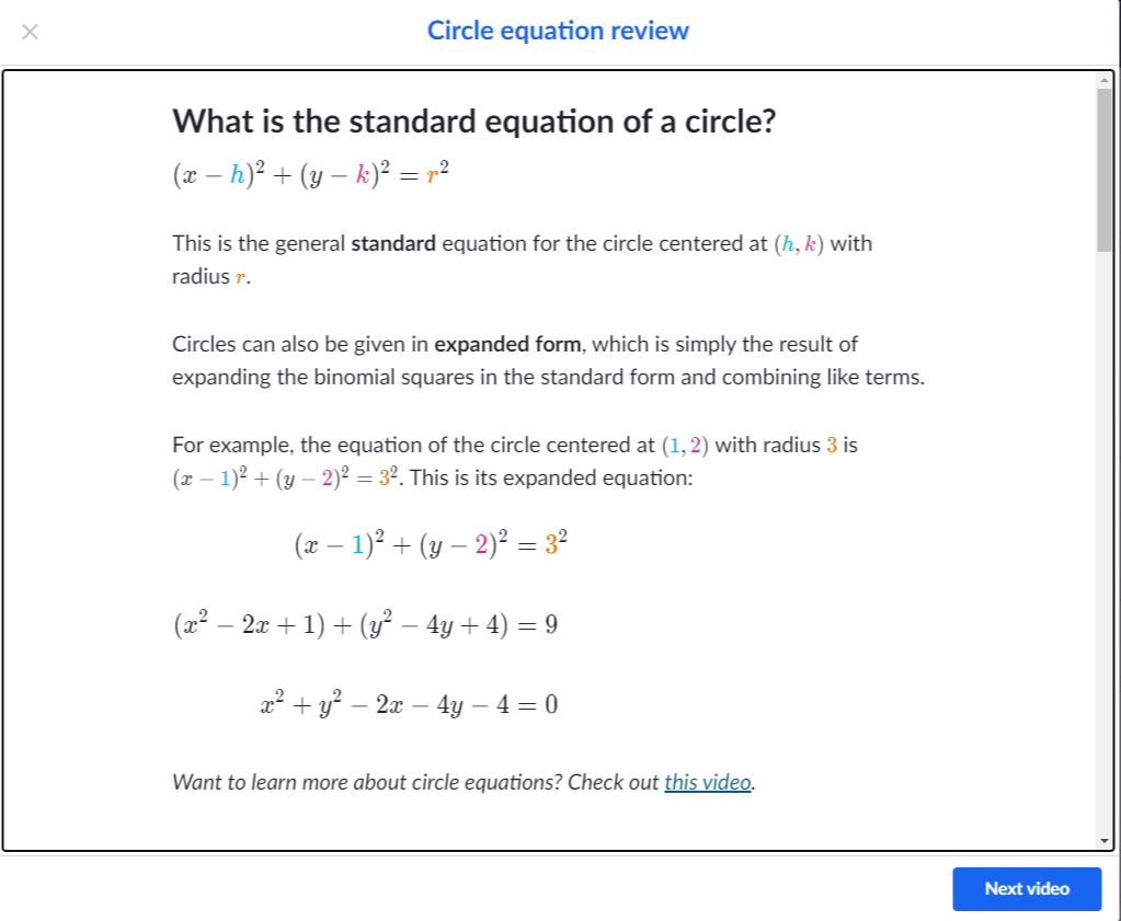 원의 방정식의 형태와 그 좌표와 반지름을 구하는 방법에 대한 서술이다.