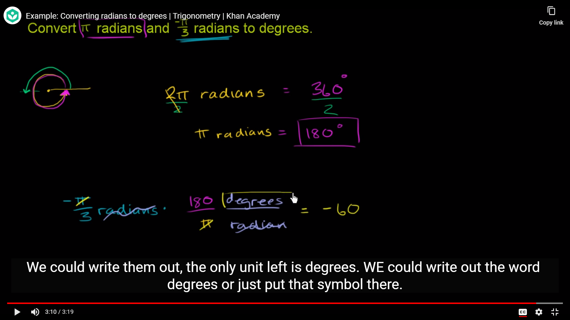 라디안 x 180/파이 -> 라디안을 각도로 바꾸는 공식