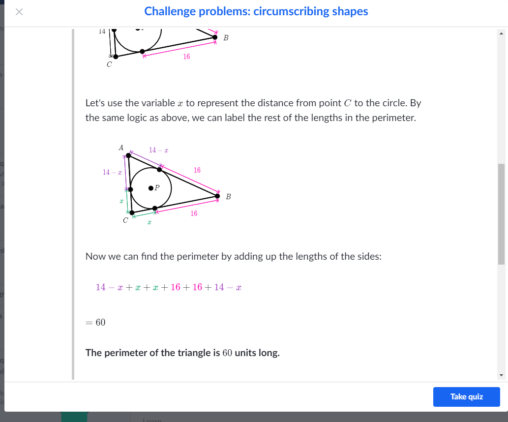 이런식으로 원과 외접한 사각형과 삼각형의 둘레는 일부분만 알고서도 유추할수있다.