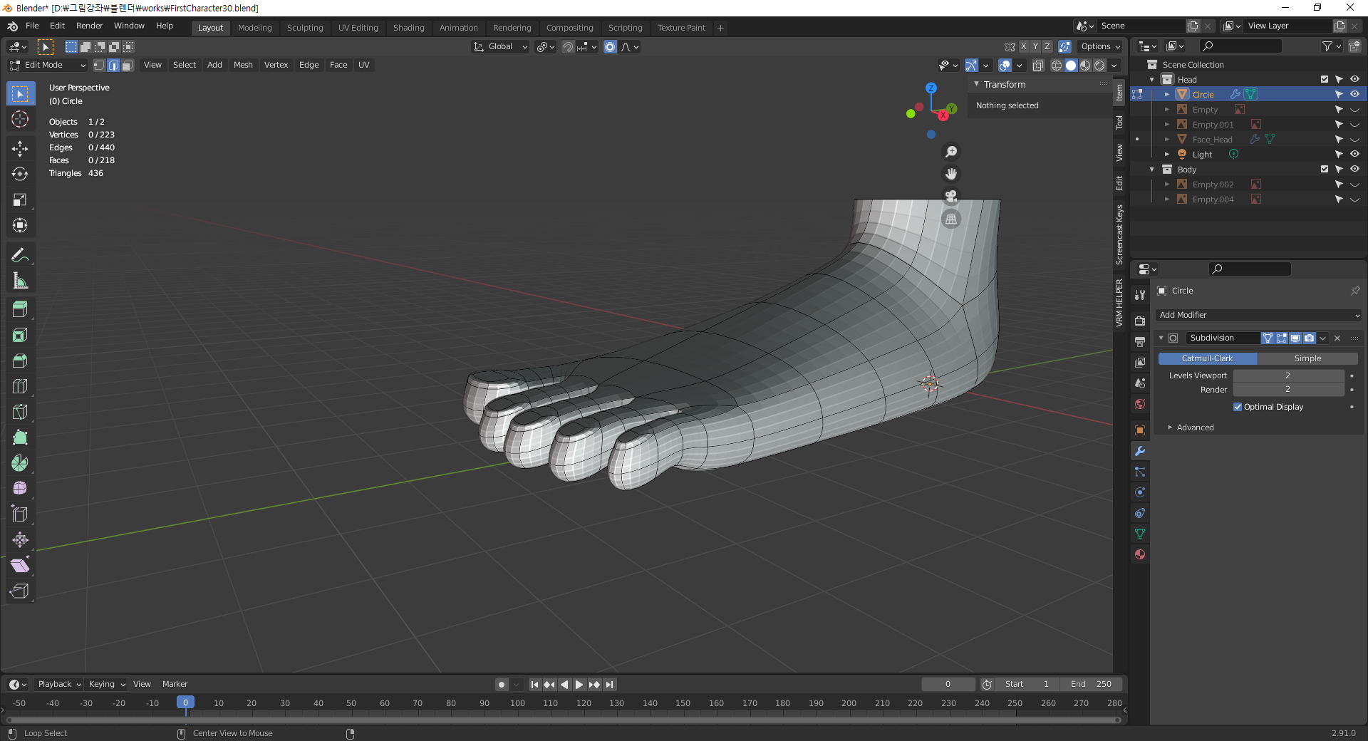 발을 모델링을 하기 위해 우선 전체 캐릭터를 하이드 시키고