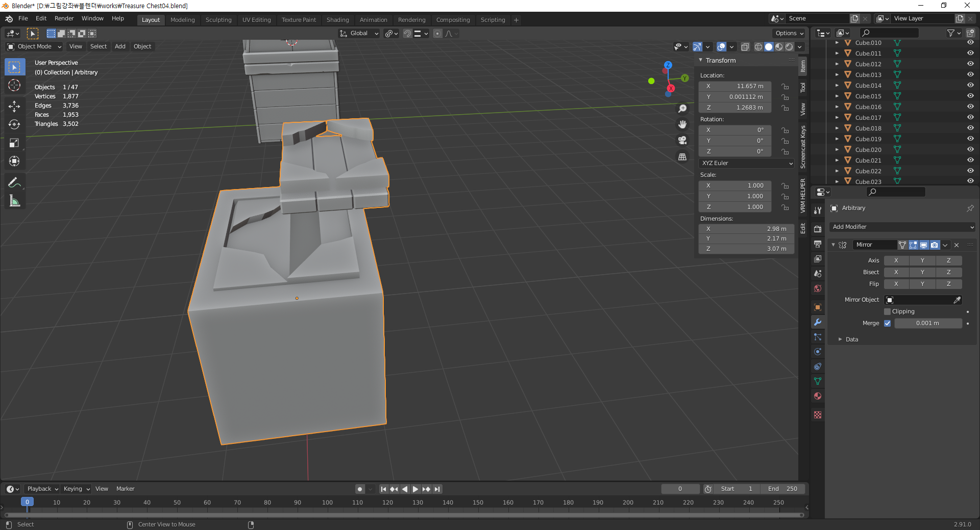 마지막은 Mirror Modifier로 기준점이 될 오브젝트를 선택후