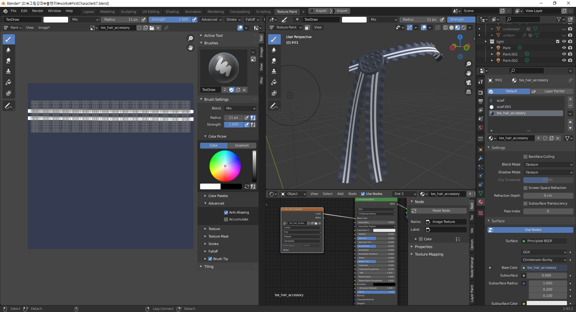 프리뷰만 나온느것인기 때문에 shading 탭에서 노드를 연결까지 시켜줘야 하는것을 잊으면 안된다.