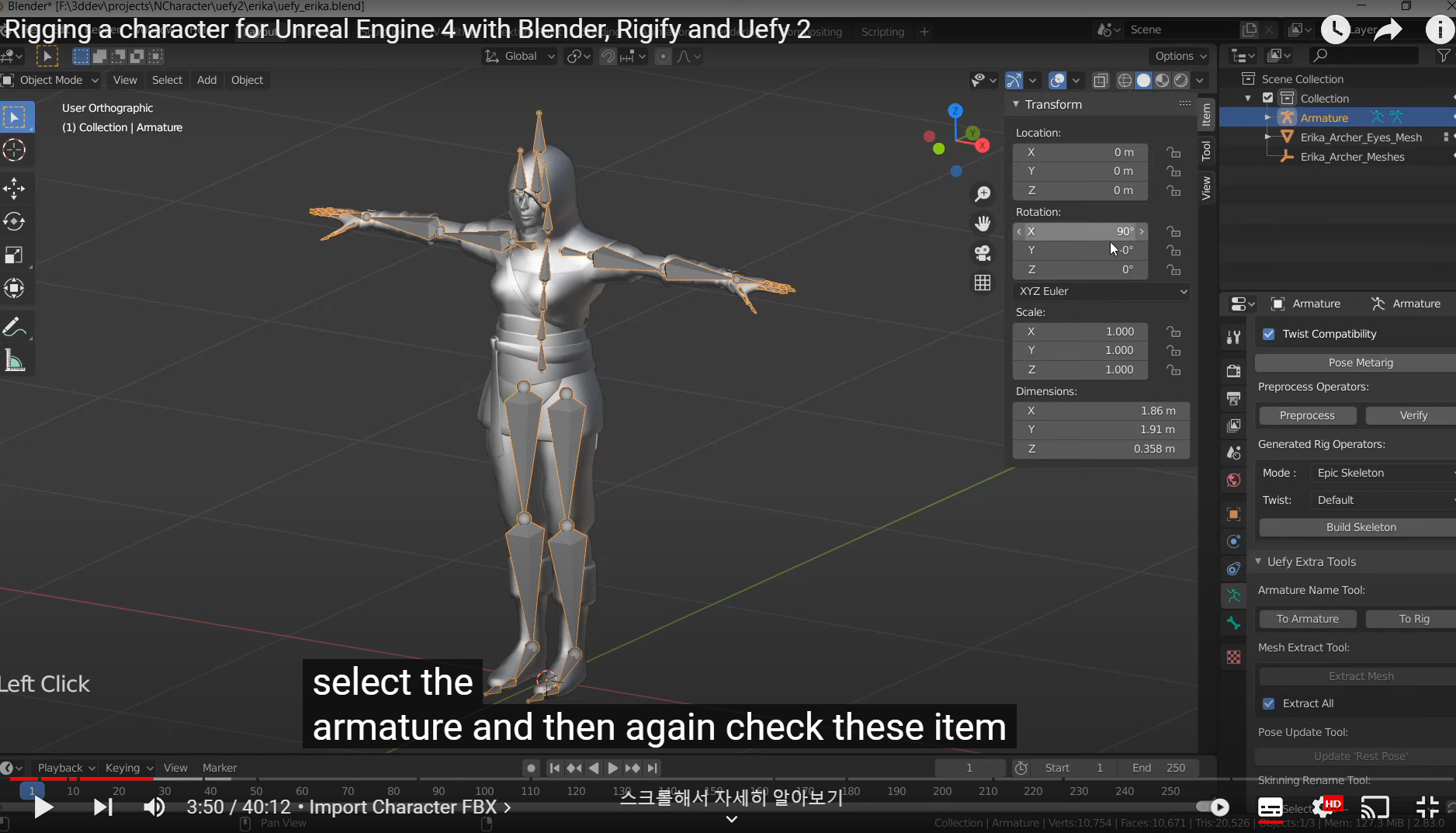 분리 되었을때 눕혀진 캐릭터를 다시 r x 90 (맥스에는 없는 블렌더의 엄청 편리한 타이핑기능)