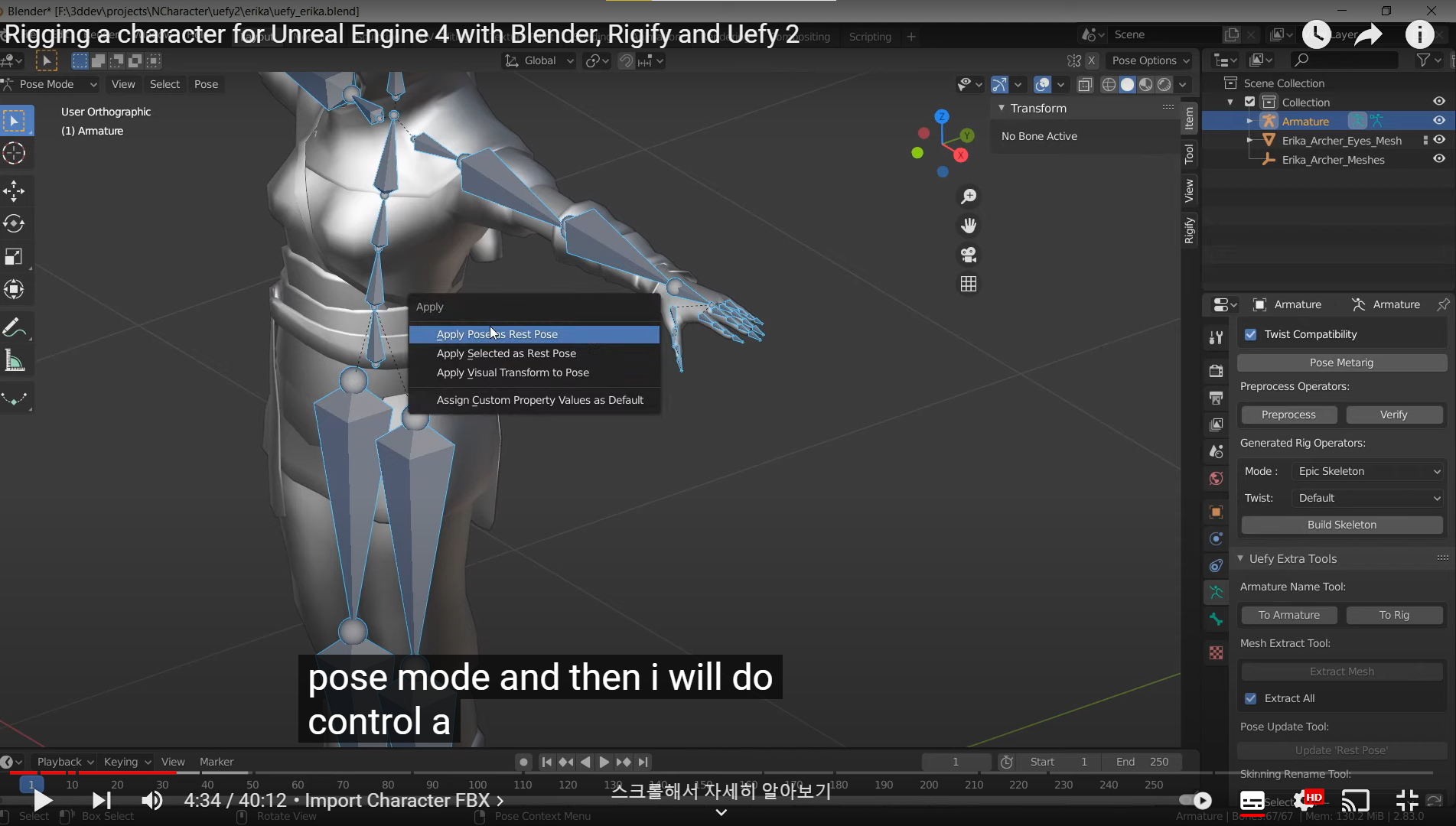 Pose 모드를 Edit 모드로 적용할때 마지막으로 Ctrl +p Armature Deform을 잊지말자.
